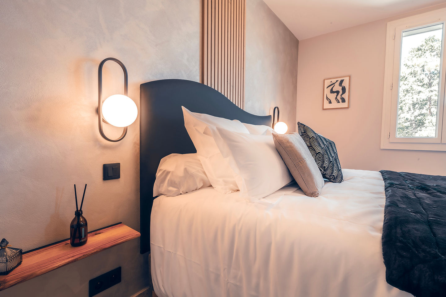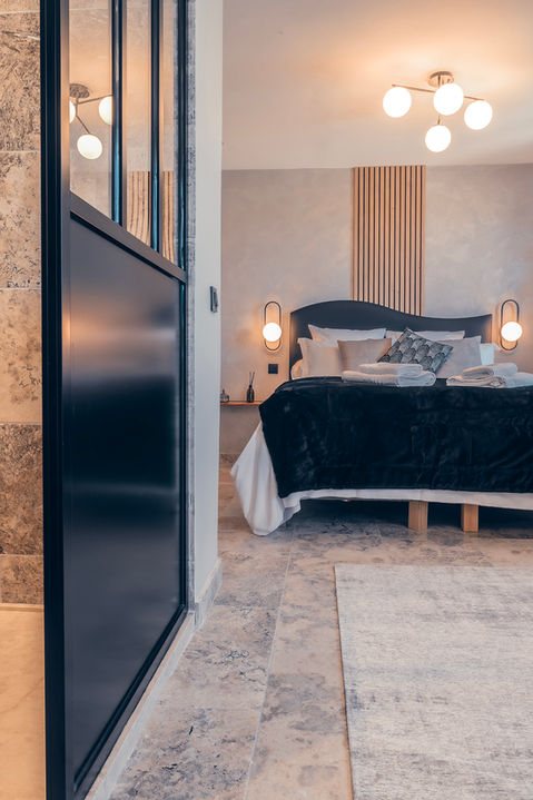 La chambre est située au 2ème palier et profite d’une vue intimiste sur le jardin. L’univers est minimaliste et propose un salon cossu et généreux ainsi qu’une très belle salle d'eau à découvrir.
